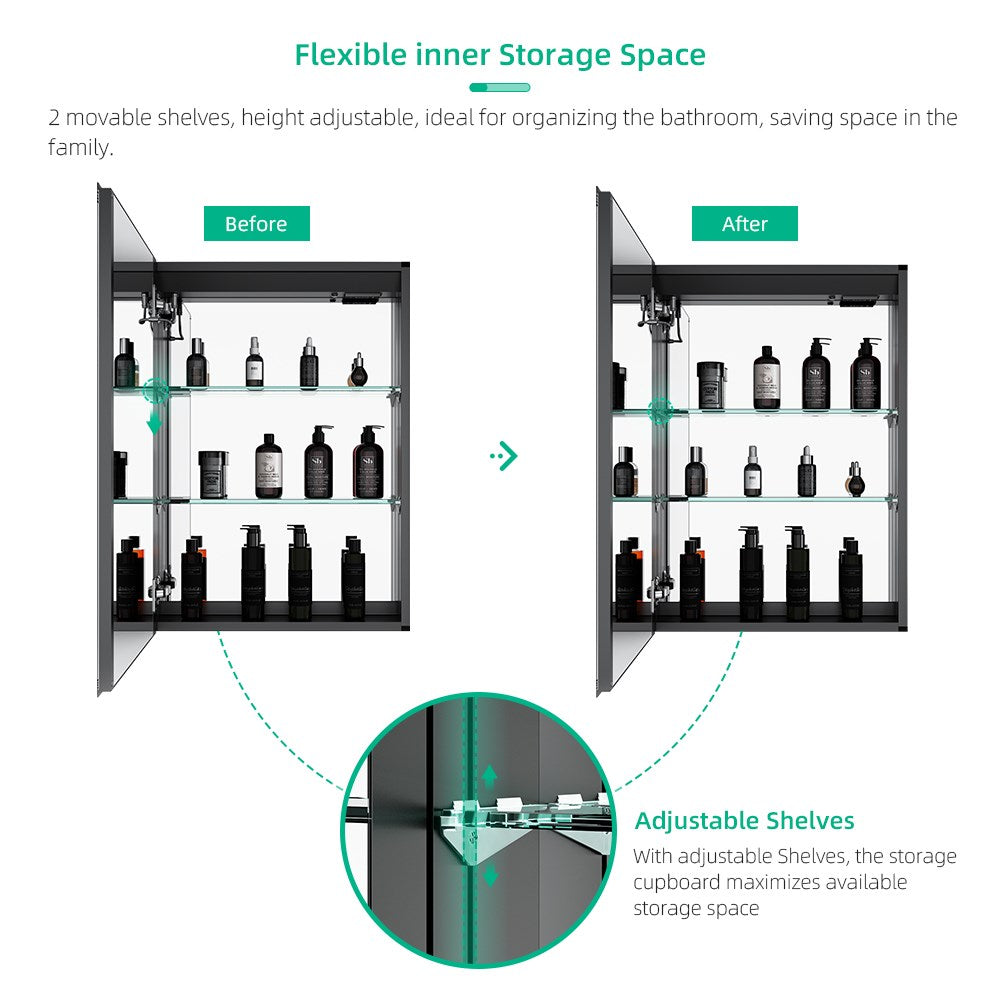 - Adjustable Shelving: You can easily divide the inner storage space by adjusting the position of glass shelves, it will maximize the available space in your room and give you a clean and tidy bathroom.