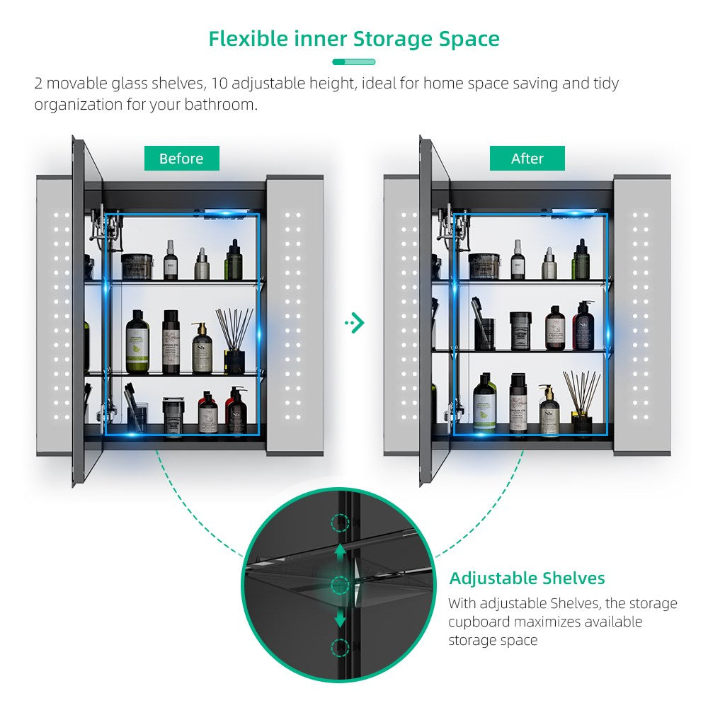 - Defogging Design: The Anti-fog function is controlled by the Touch-switch, the hidden demister pads are heated at an intelligent constant temperature, leaving the mirror refreshed and clear, very suitable for wet bathrooms or sinks.