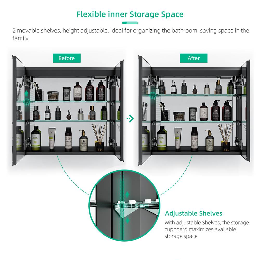 - Adjustable Shelving: You can easily divide the inner storage space by adjusting the position of glass shelves, it will maximize the available space in your room and give you a clean and tidy bathroom.